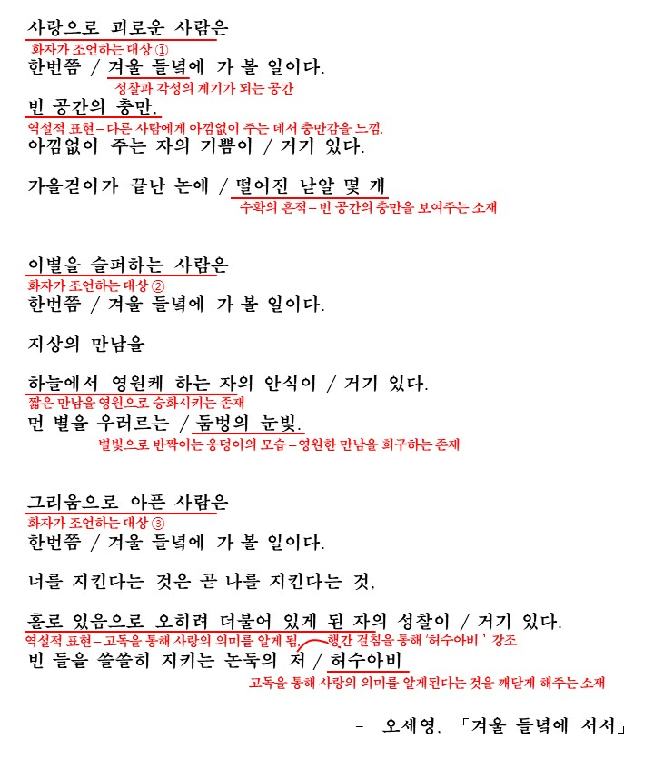 화자는 각 연에서 어떠한 사람들에게 겨울 들녘에 가볼 것을 말하고 있습니다. 그 대상은 각각 사랑으로 괴로운 사람(1연), 이별을 슬퍼하는 사람(2연), 그리움으로 아픈 사람(3연)으로 모두 무언가를 잃어버리고 가슴이 공허해진 사람들이라는 공통점이 있습니다. 화자는 그 사람들에게 빈 겨울 들녘으로 가서 빈공간의 충만과 같은 인식을 하라고 말하고 있습니다. 각각의 상황에서