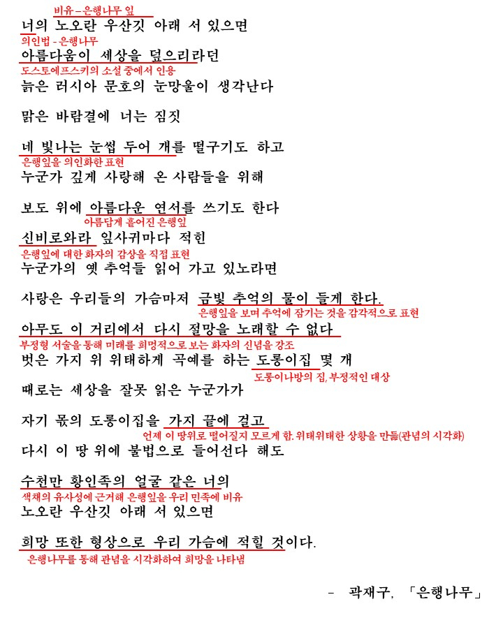 이렇게 해서 화자는 '은행나무를 바라보며 느끼는 미래에 대한 희망'을 노래합니다. 그리고 이를 자연물에 빗대어 참신하게 표현함으로서 감각적으로 형상화해서 독자들에게 전달하고 있는 것이죠.