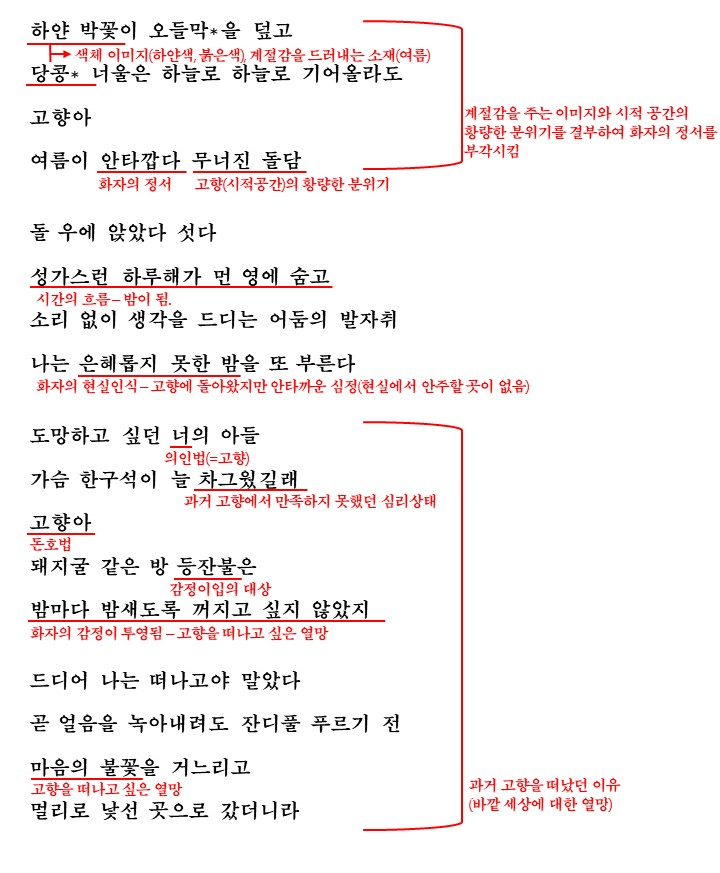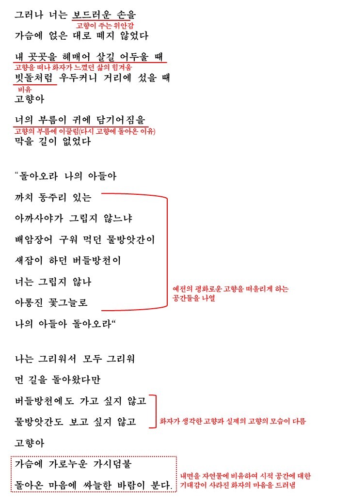 이러한 내용을 고향을 사람처럼 의인화하여 대화하는 형식을 통해 더욱 효과적으로 보여주고 있는 것이죠.