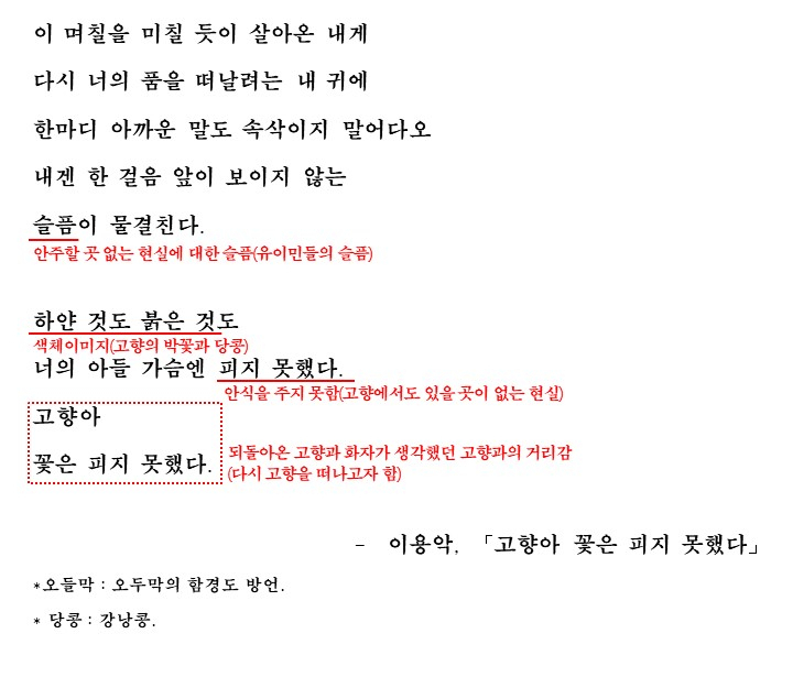 이번 시간에 다룰 시 '고향아 꽃은 피지 못했다'는 일제 강점기에 고향을 떠나 살아야만 했던 유이민들의 삶을 형상화하여 나타내고 있습니다. 화자의 현재 상황에 주목하여 시를 감상한 후 해석을 통해 학습해보도록 합시다.