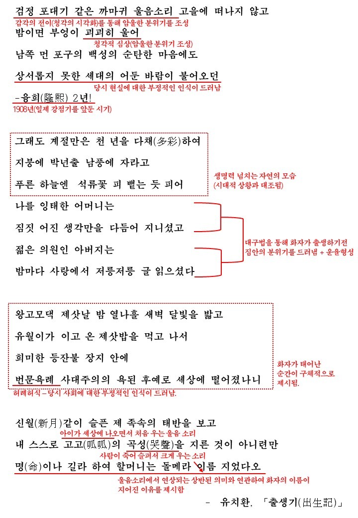 시의 처음에서부터 암울한 분위기가 나타납니다. 검은 포대기 같은 까마귀 울음소리(공감각적 심상), 부엉이의 괴괴한 울음(청각적 심상)은 당시 현실의 어두운 분위기를 말해주며 이러한 분위기 때문인지 백성들의 순탄한 마음에도 상서롭지 못한 어둔 바람이 불어오고 있었죠.(이는 융희 2년이라는 당시 시간적 배경에서 이유가 드러납니다. 융희 2년은 1908년, 1910년부터 시작된 일제강점기를 앞둔 시기였기 때문에 사회적으로 어두운 그림자가 드리운 것이죠)