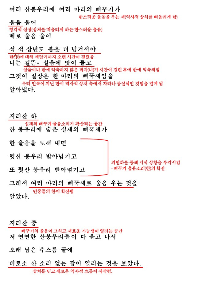 2연은 지리산 아래에서 한이 확산되는 모습으로 화자는 의인화를 통해 민중들의 한(뻐꾸기 울음소리)이 확산되는 모습을 보여줍니다. 이렇듯 하나의 한은 단지 개인적인 것이 아닌 민중들이 함께 나누는 한으로 확산됩니다.