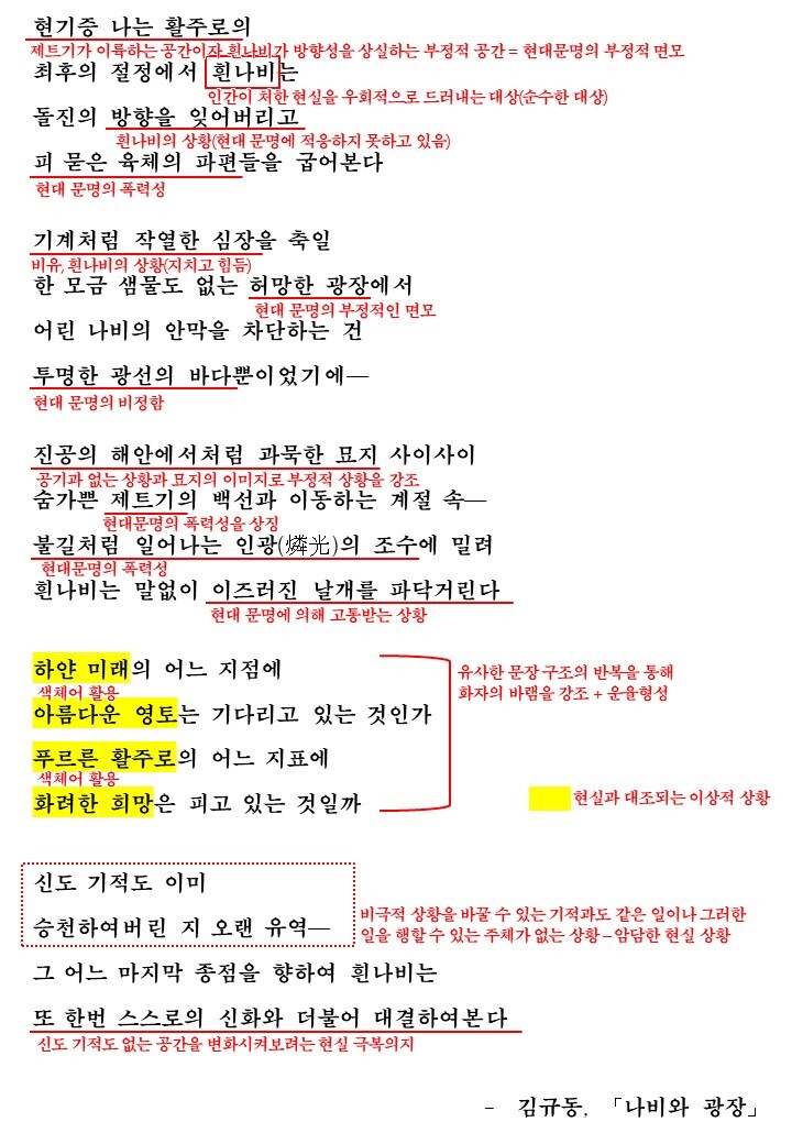 이번에 다룰 시 '나비와 광장'에서는 흰나비를 관찰하면서 흰나비가 처한 현실을 말해줍니다. 그리고 이 현실에서 현대문명에 의해 개발된 무기나 공간들이 가진 폭력적인 이미지가 드러나고 그 폭력성때문에 희생당한 것들이 보여집니다. 그리고 마지막 부분에서 흰나비는 이러한 현실에 대응하는 모습을 보입니다. 흰나비의 대응은 무엇인지 그리고 흰나비는 무엇을 상징하는지를 생각하며 시를 읽고 해석을 통해 학습해보도록 합시다.