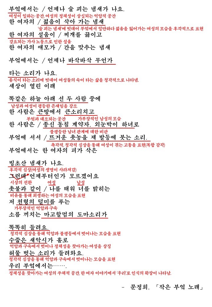 시대를 막론하고 시는 그 시대의 문제를 은유적으로 이야기하는 도구로 사용되기도 했습니다. 이번에 다룰 시 작은 부엌 노래는 요즘은 덜한 문제인 '남녀차별의 문제'를 다루고 있습니다. 여성이 받는 차별을 시인은 어떻게 나타내고 있는지에 중심을 두고 시를 감상한 후 해석을 통해 학습해보도록 합시다.