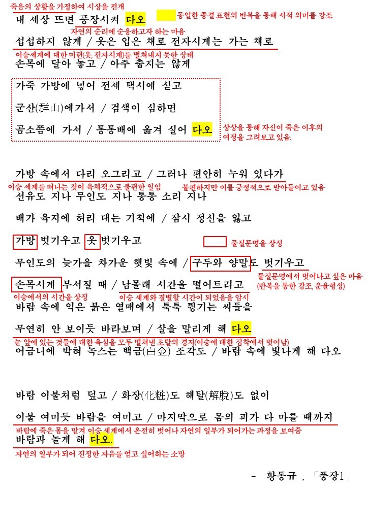 이렇게 화자는 죽음 이후의 상황을 자신의 상상 속에서 그려 냄으로써 물질문명의 구속에서 벗어나 진정한 자유를 획득해 가고자 하는 소망을 더욱 풍부하게 전달하는 효과를 얻고 있는 것이죠..