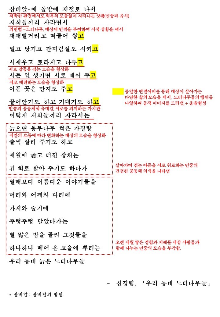 이러한 느티나무는 '민중'을 상징하는 것으로 시인은 느티나무의 모습을 통해 '공생과 나눔을 바탕으로 한 공동체적 삶의 아름다움'을 형상화 하고 있습니다.