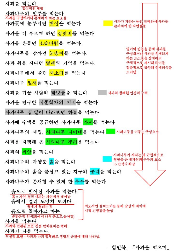 시는 사과를 먹는다는 일상적인 체험에서 시작됩니다. 이 먹는다는 표현은 이 이후로 유사한 문장구조가 열거 반복되면서 대상이 확장되며 주제 의식을 드러내는데요.