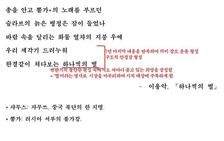 그래도 이들은 희망을 품고 있습니다. 이 시에서 반복되는 밤하늘의 별(시의 제목에서도 언급되는 하나씩의 별)은 변환기의 불안한 현실 속에서도 열차의 지붕위에서 함께 밤하늘의 별을 바라보며 미래에 대한 희망을 지니고 있다는 것을 보여줍니다.