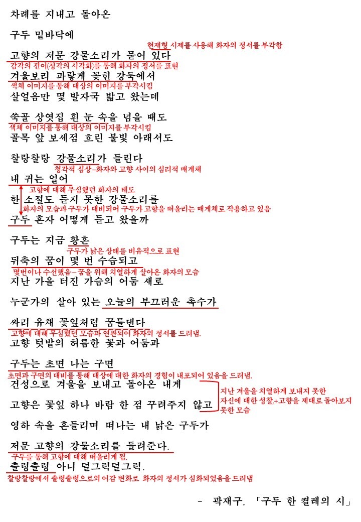 이러한 마음을 시인은 낡은 ‘구두’를 통해 그리고 감걱적 이미지를 활용하여 잘 드러내고 있습니다. ‘구두’가 낡도록 아마도 바쁘게 살았을 화자는, 오랜만에 돌아간 고향을 다시 떠난 후에야 자신이 듣지 못했던 고향의 강물소리를 구두가 기억하고 있다고 생각하며 그동안 고향을 돌아보지 않고 무심하게 살았던 자신의 모습을 되돌아보고 있다. 특히 마지막 시행에서ㅕ ‘구두’가 들려주는 저문 고향의 강물소리’의 어감 변화(음성 상징어 찰랑찰랑에서 출렁출렁으로)를 통해 화자의 울림과 심화된 정서을 드러내고 있습니다.