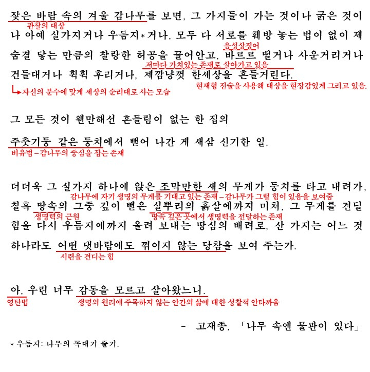 자연에는 우리가 본받을 만한 수많은 삶의 이치가 녹아있습니다. 이번 시간에 다룰 시 '나무 속엔 물관이 있다'에서도 겨울 감나무를 보며 느낀바를 통해 인간의 삶을 성찰하는 데요. 화자가 말하는 감나무의 특징에 주목하며 시를 읽고 해석을 통해 학습해 보도록 합시다.