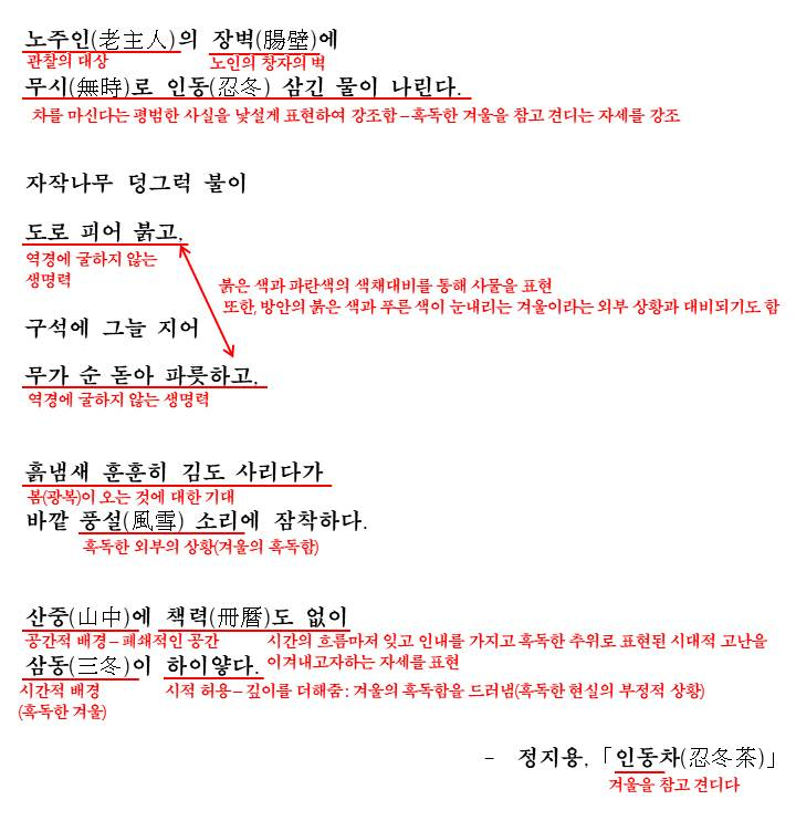 이를 이 시가 지어진 '일제강점기'라는 상황과 연관시키면 이렇게 추운 겨울은 '혹독한 현실'로 그만큼 일제의 수탈이 심했다는 것을 나타내며 노인이 인동차를 마시는 것은 바깥세상에 초연한 채 몸을 다스리고, 정신적 고결함을 지키면서 혹독한 현실을 견디고자 하는 의지를 드러내고 있는 것으로 이해할 수 있습니다.