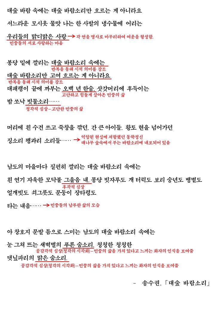 이렇듯 이 시는 대숲 바람소리 속에서 '민중의 꿋꿋한 정신'을 발견하고 있습니다.