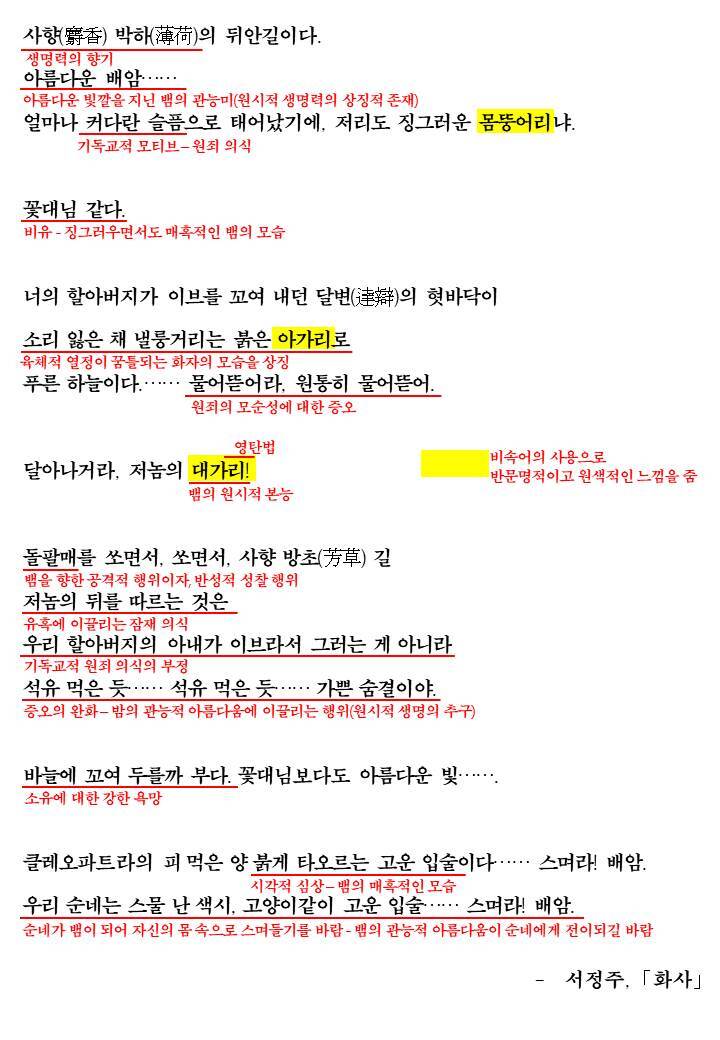 이렇게 해서 시인은 '원시적 생명력의 갈구'라는 의미를 독자들에게 전달하는 것이죠. 이러한 내용을 뱀을 통해서 다양하게 비유하며 '붉은' 시각적 이미지를 더해 더욱더 선명하게 전달하고 있는 것입니다.