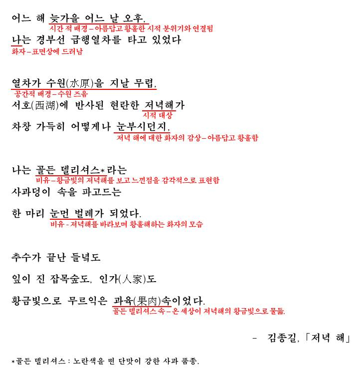 화자는 지금 열차 안에 있습니다. 그 열차가 수원을 지날 무렵 화자는 서호(西湖)에 반사된 저녁해를 보게 됩니다. 화자는 이 저녁해를 보며 현란하고 눈부시다고 느끼면서 그 저녁해의 모습에 빠져듭니다. 이러한 자신의 모습을 비유를 통해 골든 델리셔스라는 사과 속을 파고드는 눈먼 벌래로 표현하며 가을 들녘과 세상 모두가 황금빛으로 무르익은 과육 속이였다고 비유를 통해 자신이 느낀 황홀함을 표현합니다. 이렇듯 이 시는 저녁해를 보고 느낀 황홀함을 비유를 통해 표현하고 있습니다.