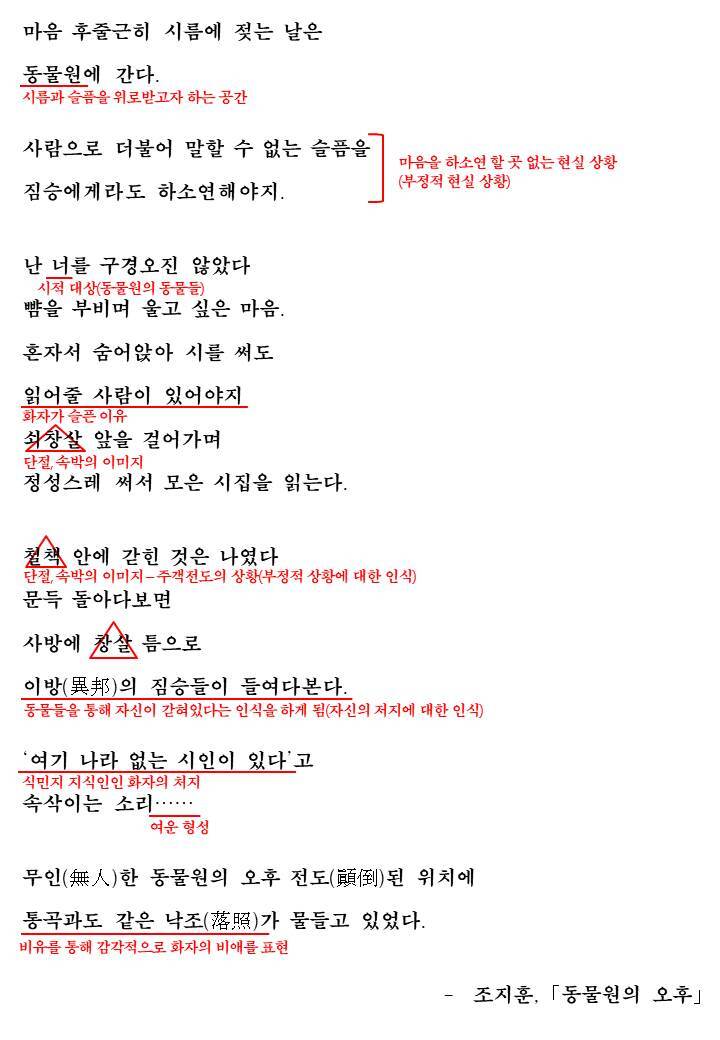 시는 화자의 마음을 드러내며 시작됩니다. '마음 후줄근히 시름에 젖는'이라는 말을 볼 때 화자의 상황은 부정적인 것으로 알 수 있습니다. 화자는 동물원에게 가 말할 수 없는 슬픔을 짐승에게라도 하소해야한다고 말하는데요. 그만큼 화자가 처한 상황이 좋지 않은 걸 알 수 있습니다. 동물원 가서 화자가 슬픈 이유가 밝혀지는 데 시를 써도 읽어줄 사람이 없는 현실 때문에 화자는 이토록 슬퍼하고 있는 것이었습니다. 그래서 동물원에가 동물들 앞에서 시를 읽는 화자는 문득 생각하게 됩니다. 쇠창살에 갇혀있는 건 동물들이 아니라 반대로 자신이었다고 말이죠. 자신이 동물들을 지켜보고 있는 것이 아니라 동물들이 자신을 들여다보는 것으로 말이죠. 이는 주객전도의 표현으로 화자가 자신의 상황을 얼마나 슬프게 이해하고 있는지를 알 수 있습니다. 그리고 생각합니다. '여기 나라 없는 시인이 있다'라고 말이죠. 이 단어에서 화자의 처지가 구체적으로 드러나는 데요. 화자는 지금 나라를 잃은 상황이기에 이토록 슬픈 것을 알 수 있습니다. 그리고 화자는 이러한 나라 잃은 슬픔을 비유를를 통해 감각적으로 표현하며 시를 마무리합니다.