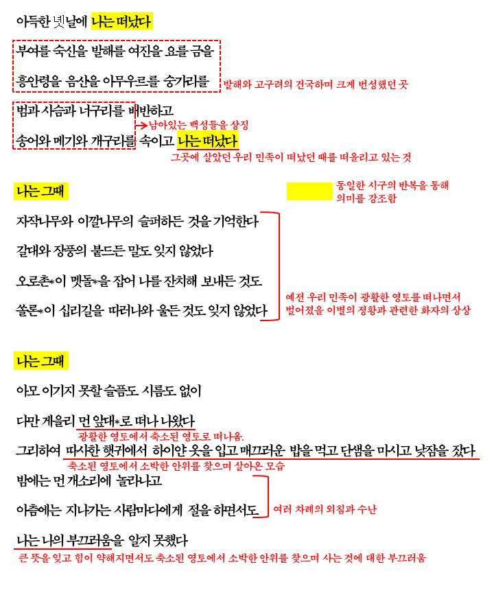 시는 옛날 이야기로 시작합니다. 시의 시작에서 녯날에 나는 떠났다고 나오는 곳은 예전 발해와 고구려를 건국하며 크게 번성했던 곳 지금의 한반도 위쪽 요동반도 만주 땅입니다. 화자는 1연에서 '나는 떠났다'라고 말하며 그곳에 살았던 우리 민족이 떠났던 때를 떠올립니다.