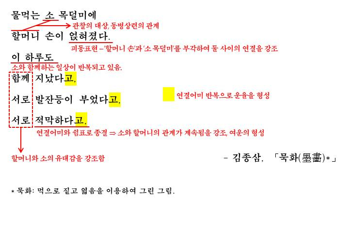 이때 보여주는 것은 소는 일을 마치고 물을 먹고 있고 할머니는 물 먹는 소의 목덜미에 손을 얹고 있는 장면으로 이 정면을 통해 소와 할머니가 함꼐 일하며 교감하고 연민을 느끼는 동병상련의 관계임을 드러냅니다. 그리고 시상을 마무리하는 연결 어미와 쉼표로 여백을 드러내어 시적 대상(할머니와 소)의 정서를 더욱 강조하며 시를 마칩니다.
