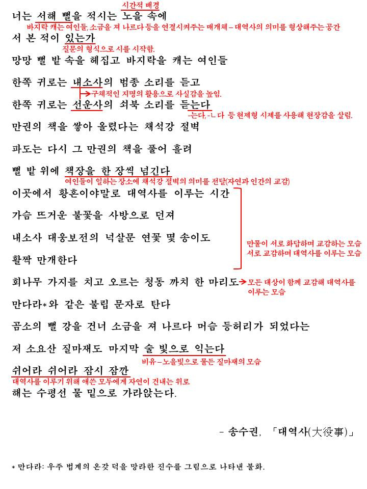 이번 시간에 다룰 시의 제목은 '대역사(大役事)'입니다. '대역사(大役事)'란 '매우 큰 토목이나 건축때위의 공사'를 나타내는 말인데요 시를 읽으며 시인이 무엇을 보고 있는지 그리고 왜 그것을 대역사라 부르는지를 생각한 후에 해석을 통해 학습해보도록 합시다.
