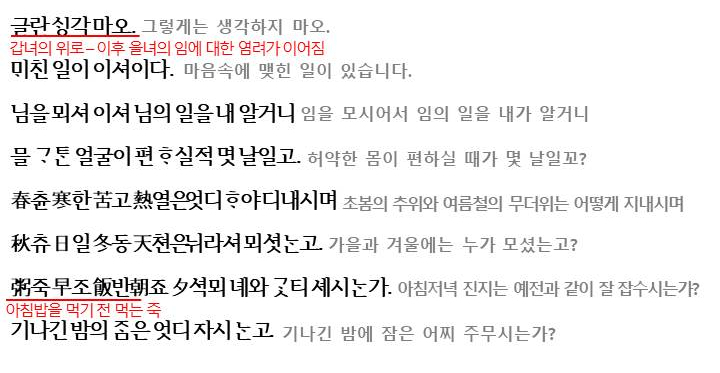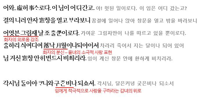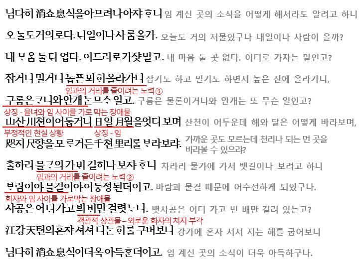 이러한 사실을 감녀와 을녀의 대화형식으로 표현하며 유배지에서 임금을 걱정하는 모습을 임과 이별한 여인에 빗대어 표현하고 있습니다.