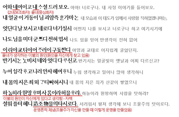 여기까지가 서사부분으로 갑녀의 질문과 을녀의 답변으로 임과 이별한 사연에 대해 이야기 하고 있습니다.