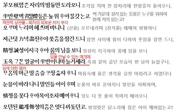 임의 소식을 듣지 못하고 돌아온 화자. 벽 가운데 등불이 밝게 켜져있지만 이를 보고 돌아올 이는 없습니다.(이 반벽청등 역시 객관적 상관물로 작용하며 화자의 외로움을 부각시킴비니다) 이에 슬픔을 느끼며 잠깐 잠을 드는데 꿈에서 임을 만나게 됩니다. 이 꿈이 임과 만나게 해주는 매게체로 작용하며 임의 모습에 염려하며 말을 하려하지만 닭소리에 잠이 깨버리게 되며 본사는 끝이납니다.