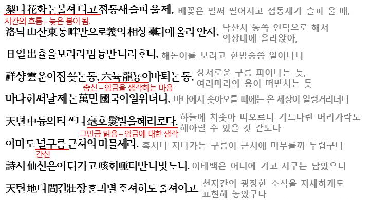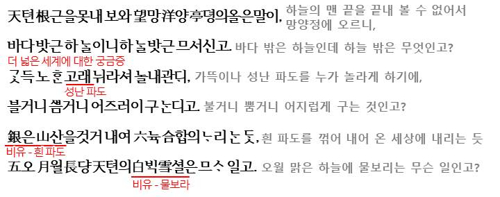 의상대에서 일출의 장관과 김회에 대해 노래하며 우국지정을 보여줍니다. 녈구름(간신)이 임금 옆에 머물까를 걱정하는 신하로서의 모습을 표현한 부분입니다.