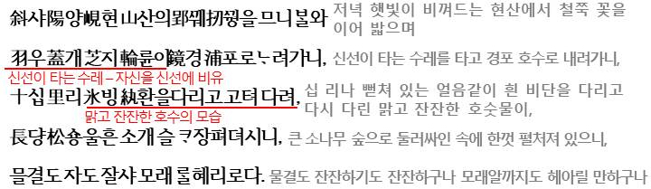 역시 관찰사로서의 위정자적 면모와 자연을 즐기며 신선과 같은 생활을 하고 싶은 마음이 동시에 드러납니다. 화자의 내적 갈등은 계속되고 있는 것이죠.