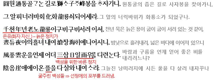그리고 화룡소에 와서는 자신을 용에 비유하며 비를 내려 시든 풀(백성)을 살리겠다는 청치가로서의 포부를 드러냅니다.