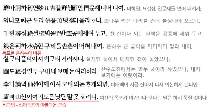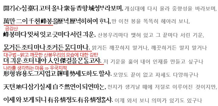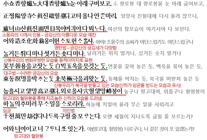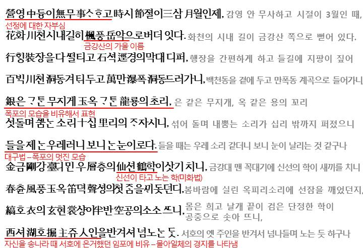 금강산 유람의 시작부분입니다. 막폭동 폭포의 장관을 용에 꼬리에 비유하고, 금강대에서는 화자 자신을 서호의 옛 주인(임포)에 비유해서 물아일체의 경지를 드러내고 있습니다.