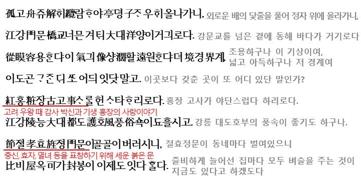 이제 경포에 와서 경포의 장관과 강릉의 미풍양속에 대해 노래합니다. 화자가 강원도 관찰사인 만큼 자신이 다스리는 곳에 이런 멋진 곳이 있다는 걸 노래한 부분이라고 생각하면 되겠습니다.