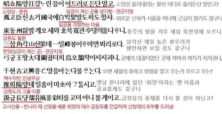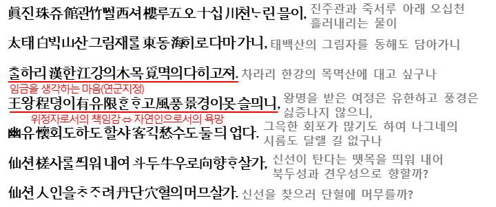 임금과 멀어지니 임금을 생각하는 마음을 표현하면서도 강원도 관찰사로서 선한 정치를 하겠다는 포부를 한나라 때의 인물 급장유를 언급하며 드러냅니다.