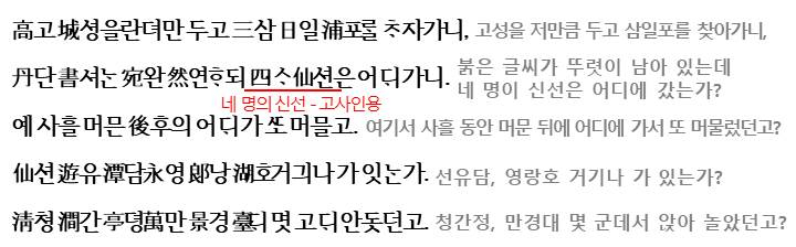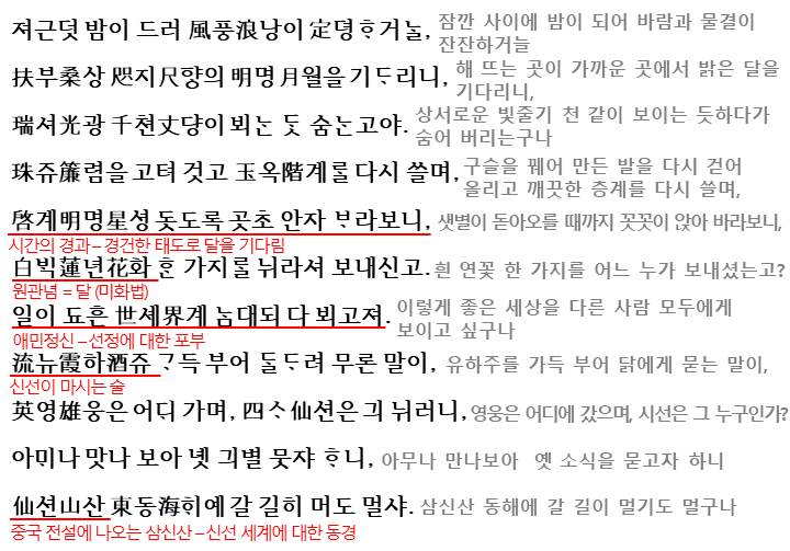 삼일포에서 네 신선을 회고하며 동경하는 부분입니다. 신선을 찾는데서 도가적인 면모를 찾을 수 있으며 슬슬 자연에서의 신선과 같은 삶을 즐기고 싶은 화자의 심정도 드러납니다.(동해로 오면서 임금의 신하로서의 자신 VS 자연을 사랑하는 자신의 내적 갈등이 심화됩니다)