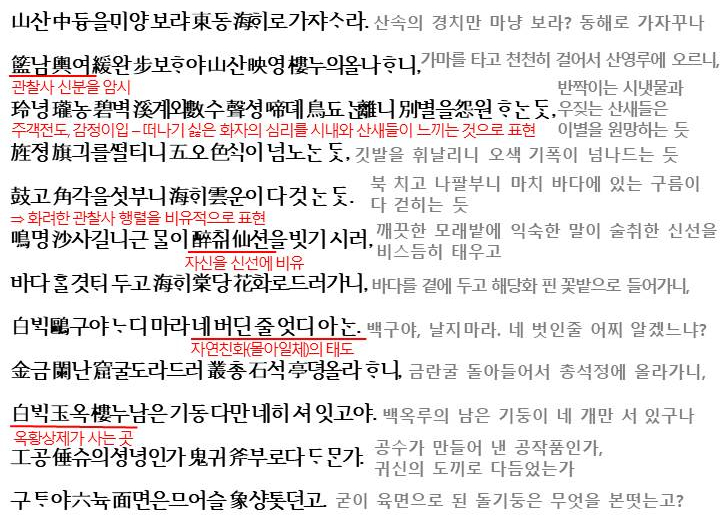 이제 바다가 보이는 동해안을 유람하기 시작합니다. 여기서부터는 본격적으로 자연을 즐기는 모습이 보여집니다. 이 부분에서도 사선봉을 백옥루의 네 기둥으로 미화해서 자연의 아름다움을 표현합니다.