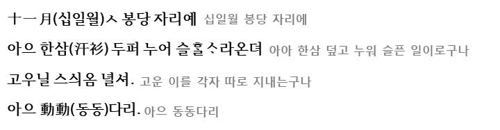 11월에는 추운 바닥에 한삼(윗옷 소매 끝에 흰 헌겊으로 길게 덧대는 소매 또는 속적삼=얇은 옷)을 덮고 누워 슬퍼하는 화자의 모습이 드러납니다. 추운 바닥에 얇은 옷을 덮으면 춥지 않겠습니까? 임이 없으니 그 추위만큼 자신이 외롭고 쓸쓸하다 라고 말하고 있는 모습입니다.