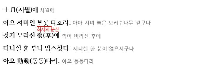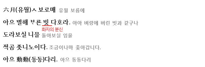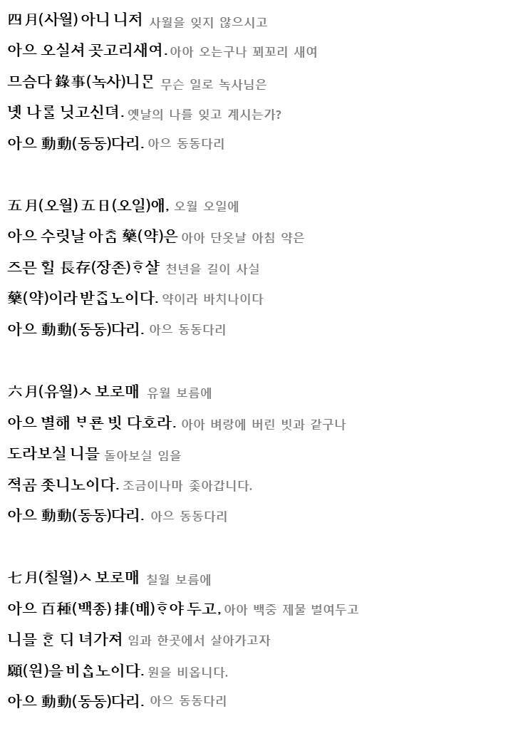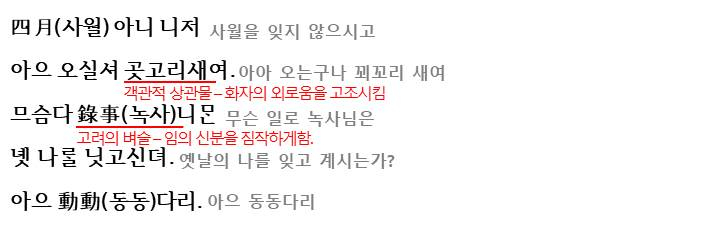 4월에서는 외로운 화자의 처지가 드러닙니다. 4월이 되면 때를 알고 꾀꼬리 새도 돌아오는데 님은 나를 잊고 돌아오지 않고 있는 것이죠. 여기서 님에 대한 원망이 조금 드러나기도 합니다. 또한 녹사님이라고 해서 임의 신분을 짐작하게 해주기도 합니다.