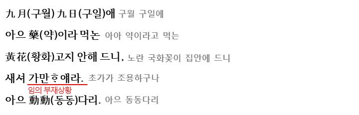 9월이 되서 약이라고 먹는 노란 국화가 집안 들 정도로 가득 피지만 집안은 고요할 뿐입니다. 님이 없기에 이렇게 고요한 것이죠. 당연히 화자는 쓸쓸함을 느끼고 있습니다.