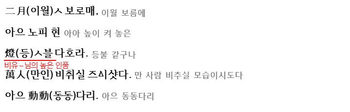 2월에서는 임에 대한 칭찬을 하고 있습니다. 빼어난 임의 인품을 높이 켠 등불에 비유하여 표현하고 있는 부분입니다.