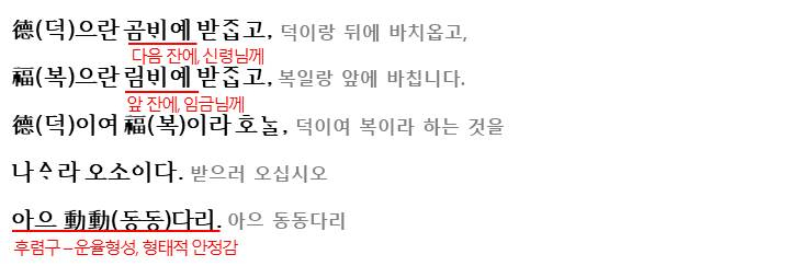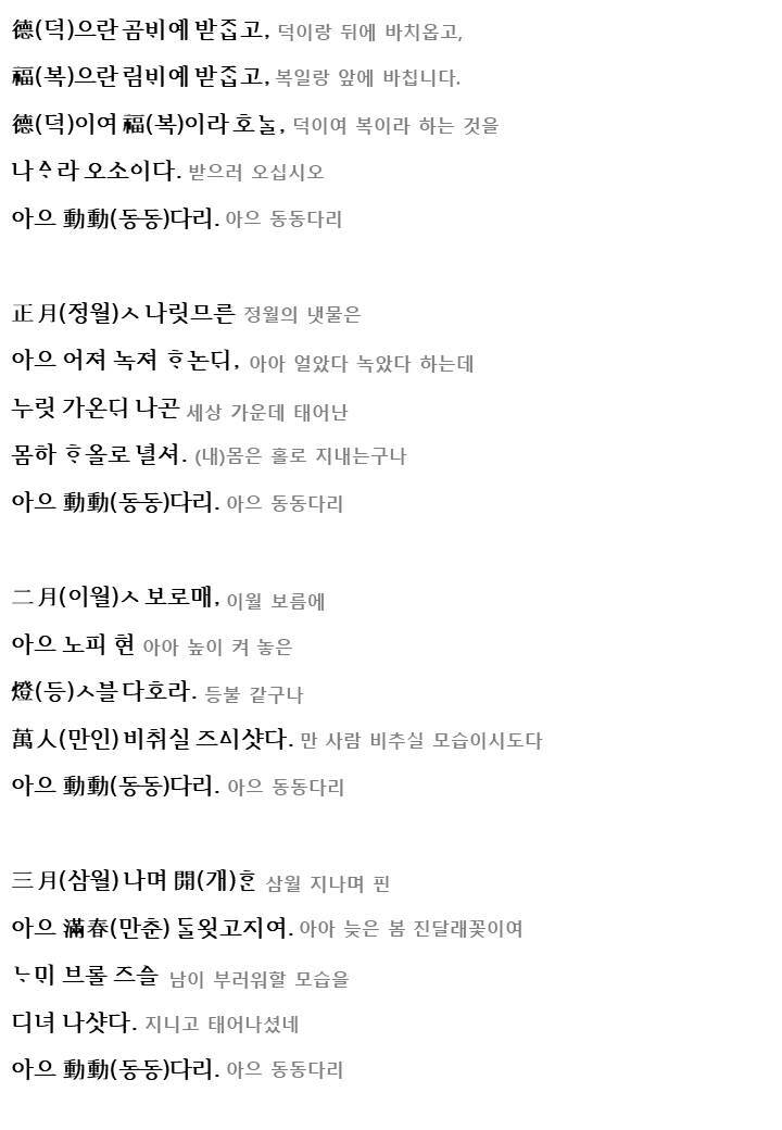 이 첫부분은 덕과 복을 비는 송도로 궁중음악으로 편입되는 과정에서 첨가된 것으로 보입니다. 고려가요 자체가 구전되던 것을 훈민정음 창제 후에 기록한 것이니만큼 궁중음악으로 쓸 때는 임금에 대한 송축은 필수였을 것으로 보입니다.(임금이 듣기에도 좋지 않겠습니까?:)