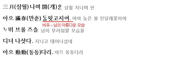 3월에도 임을 향한 송도는 계속됩니다. 이번에는 진달래꽃에 님을 비유하여 님의 아름다운 모습을 찬양(?)합니다.