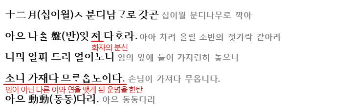 12월에는 결국 임과 맺어지지 못한 채 다른 사람과 연결되는 화자의 모습이 나타납니다. 자신을 젓가락에 비유해 님을 위해 가지런히 놓았으나 다른 손님이 가져갔다는 것은 님이 아닌 다른 사람에게 시집가는 자신의 신테를 한탄하고 있습니다.