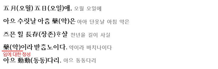 5월에서는 단오와 연결하여 임에 대한 정성을 강조하고 있습니다. 단오날 아침약이 천년을 길게 살게해주는 명약이니만큼 임에게 바치겠다 이거죠.
