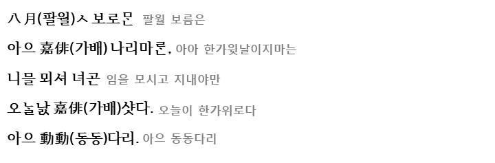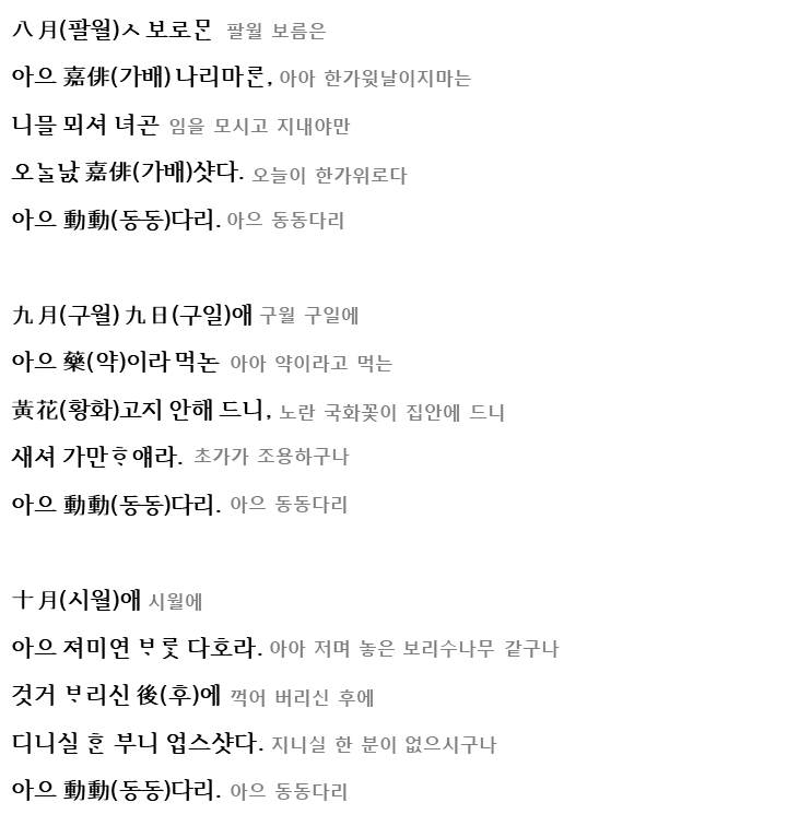 8월에는 한가윗날이라도 임이 없어서 허전한 화자의 심정이 드러납니다. 화자는 한가위날이라도 님이 계셔야지 한가위라며 슬퍼하는 모습입니다.