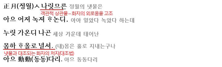 1월입니다. 정월의 냇물도 얼었다 녹았다하며 정다운데 자신은 혼자라며 외로워하는 화자의 모습이 드러납니다. 냇물이 얼었다 녹았다 하는 것을 상호작용으로 보고 자신의 처지와 대조하는 것으로 봐서 화자가 얼마나 외로운지를 알 수 있습니다. 이 때 냇물은 '객관적 상관물'로 화자의 외로움을 고조시키는 역할을 합니다.