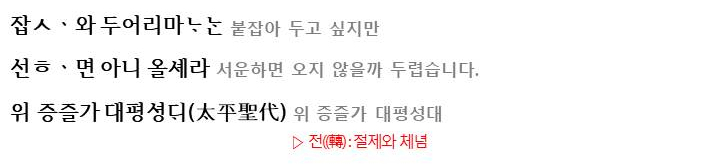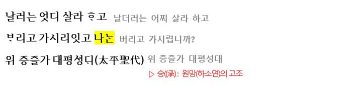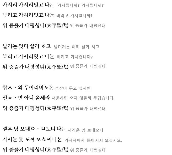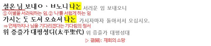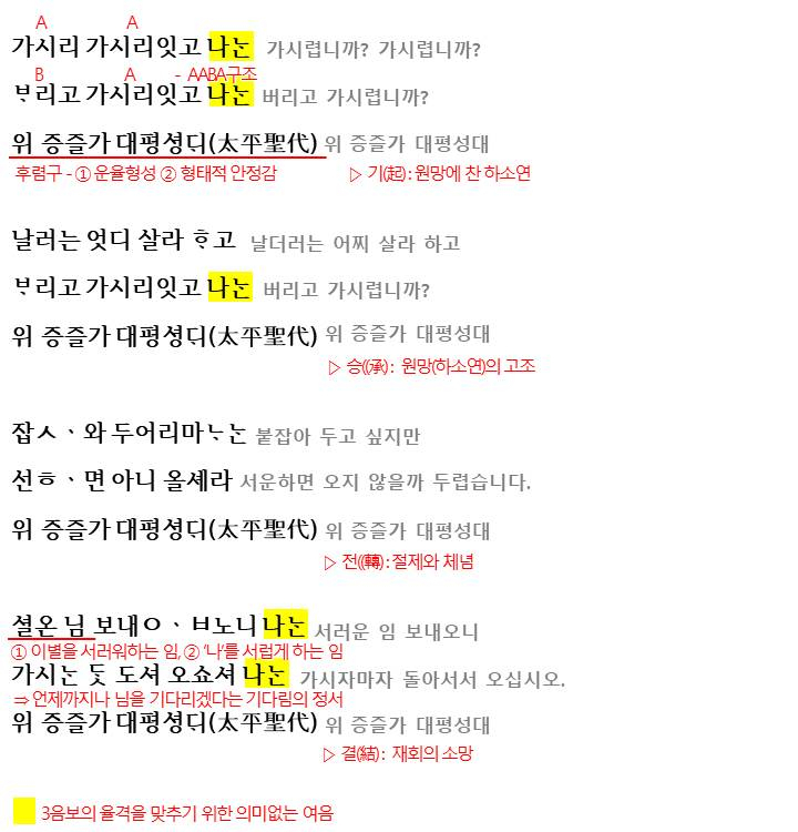 여기서 이질적인 점은 후렴구인데요. 이별의 상황과 어울리지 않는 송축의 후렴이 붙은 것은 궁궐에서 불리우면서 첨가된 것으로 추축됩니다. 이러한 후렴구는 별다른 의미를 가지고 있지 않기에 의미강조의 기능은 없이 운율을 형성하고, 이 노래들이 하나의 노래라는 형태적인 안정감(통일성)을 줍니다.