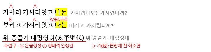 형식적인 측면에서는 AABA구조로 화자의 심정을 강조하며 리듬을 형성합니다. 또한 3음보의 율격을 맞추기 위해 여음구(나는-노란테두리 부분)가 쓰인 것을 볼 수 있습니다.