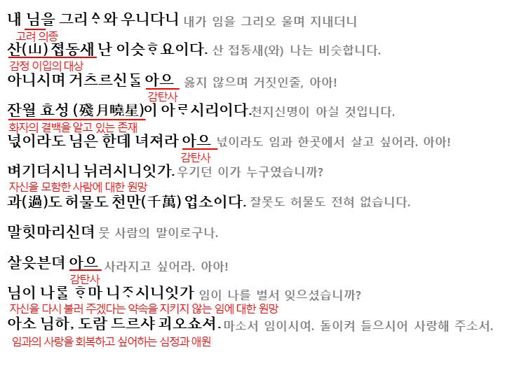 이 작품의 특이점으로는 1~4행, 5~9행, 10~11행의 3단 구성, 감탄사 '아소'의 사용 등으로 향가의 잔영이 남아있다는 점입니다.