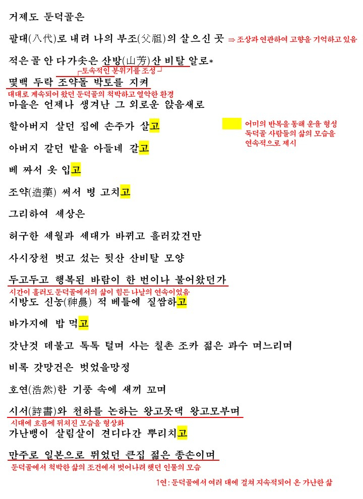 1여에서 화자는 둑덕골에서 여러대에 걸쳐 지속되어 온 가난한 삶의 모습을 보여주고 있습니다. 조상 대대로 살아온 둑덕골이지만 사실 묘사된 모습을 보면 아름다워 보이지는 않습니다. '조약돌 박ㅌ토'에 '행복된 바람'이 한 번도 불어온 적 없을 만큼 가난한 마을로 마을 사람들 모두 누추한 삶을 살아가고 있는 공간이죠. 심지어 1연의 마지막에는 종손이 만주와 일본으로 뛰었다는 표현으로 둔덕골의 척박한 환경을 드러냅니다.