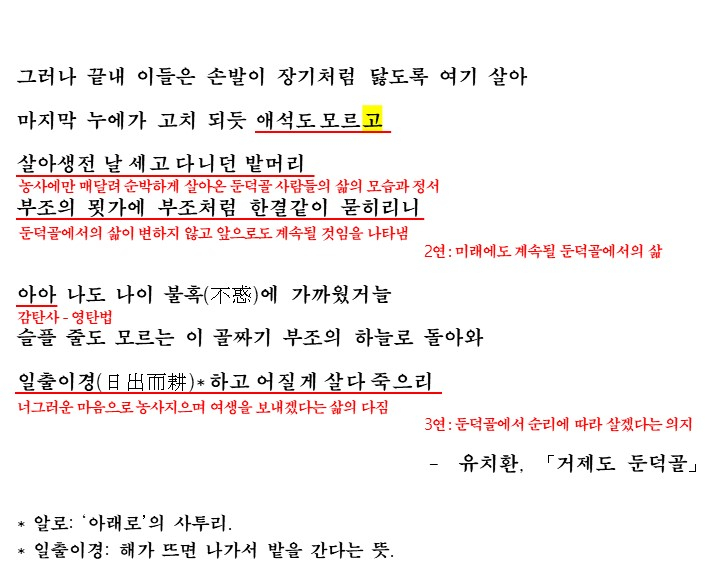 이번에 다룰 시 '거제도 둔덕골'에서도 화자는 고향을 언제든 돌아갈 곳이라고 인식하는데요. 화자가 말하는 고향의 모습과 살고자 하는 삶의 방향에 대해 생각하며 시를 읽고 해석을 통해 학습해보도록 합시다.