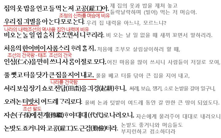 이렇게 고공가에서는 비유적인 표현을 통해 우의적으로 '임진왜란 직후 나태한 조정 관리들의 탐욕과 정치적인 무능을 비판'하고 있습니다.