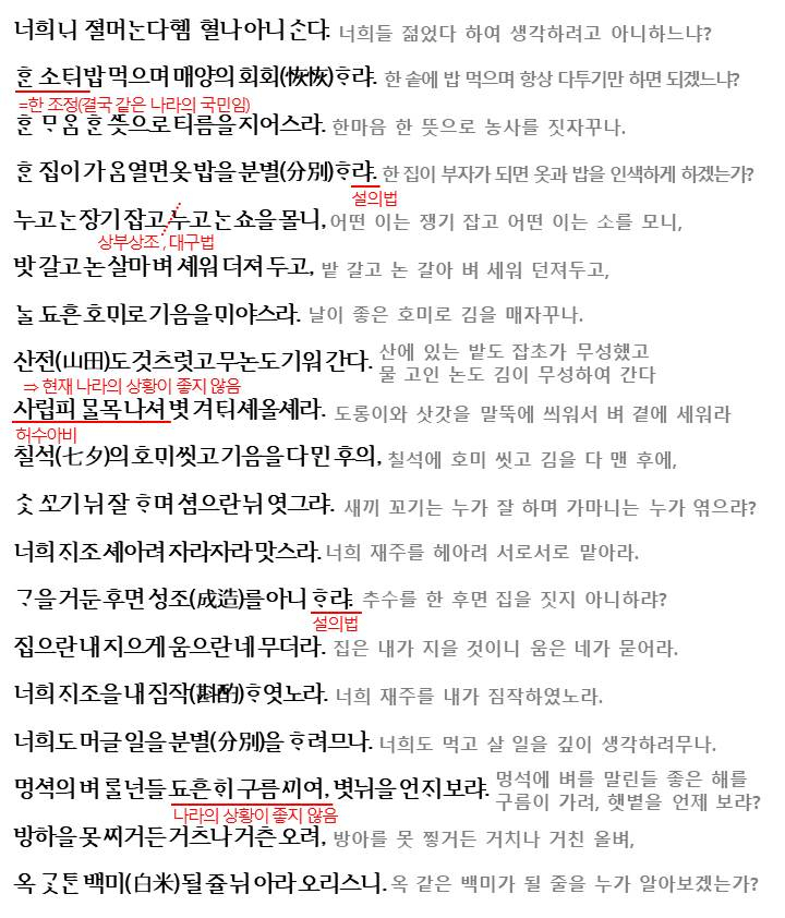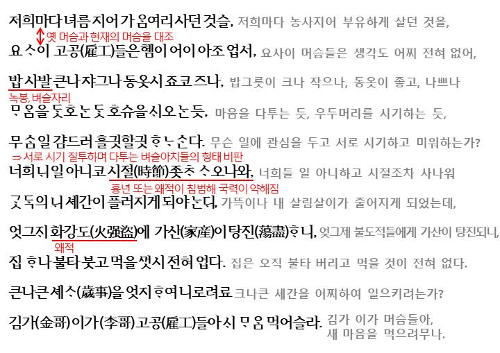 질책은 계속됩니다. 머슴들이 다투는 행위(조정에서 서로의 이익만 따지면서 반복하는 관리들)를 질책하며 상부상조하여 농사에 힘들것을 당부하고 각성을 촉구하고 있습니다.